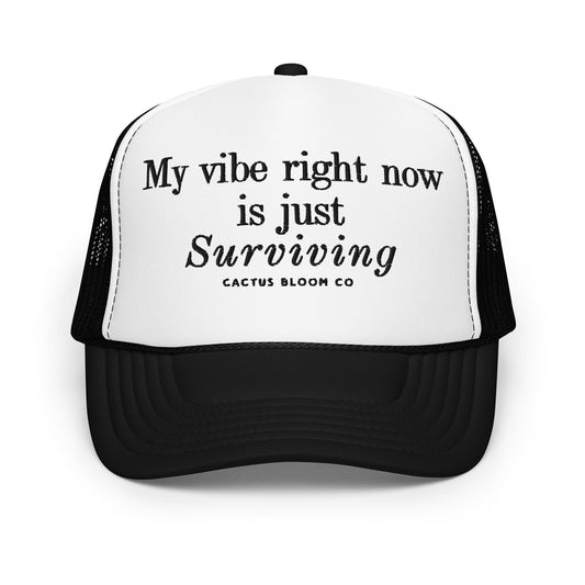 VIBE RIGHT NOW IS JUST SURVIVING EMBROIDERED TRUCKER HAT